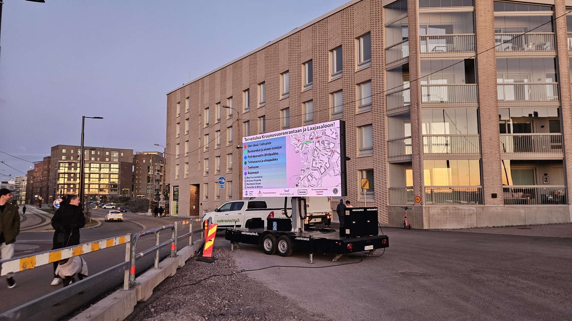 Meillä on kappalemääräisesti Suomen laajin kapasiteetti siirrettäviä LED-näyttöjä. Räätälöimme laajoille alueille visuaalisia informaatiojärjestelmiä suur-aluetiedotuksen tarpeisiin.